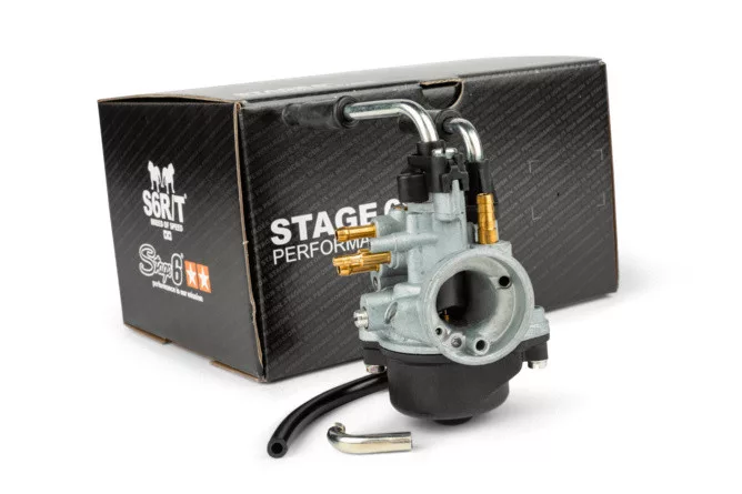 Ez a 17,5 mm-es PHBN Dellorto karburátor a Stage6-tól. A 17,5 mm-es karburátor manuális légcsappantyúval ideális választás Minarelli motorokhoz (például Yamaha Aerox, Yamaha Jog vagy Malaguti F12), de más robogókhoz, motorokhoz vagy mopedekhez is használható.