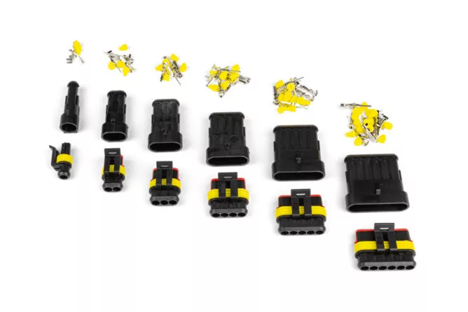Vízálló csatlakozó 1-6 vezetékhezA Superseal vízálló csatlakozók olyan alkalmazásokhoz lettek kifejlesztve, ahol a vízzárás és a magas ellenállás szükséges agresszív környezetekkel, mint például üzemanyagok, sók és motorolajok. Ezek a vízálló gyorscsatlakozók ideálisak off-road alkalmazásokhoz, ahol a nedves és piszkos körülmények gyakoriak.Az elektromos érintkező biztosítva van egy snap hook segítségével, az egyes kábelek pedig szilikon dugókkal vannak lezárva.A készlet 6 vízálló csatlakozót ta...