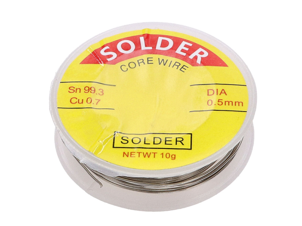 A 10g ólommentes forrasztószál, 0,5 mm átmérővel rendelkezik. Összetétel: 99,3% ón, 0,7% réz.