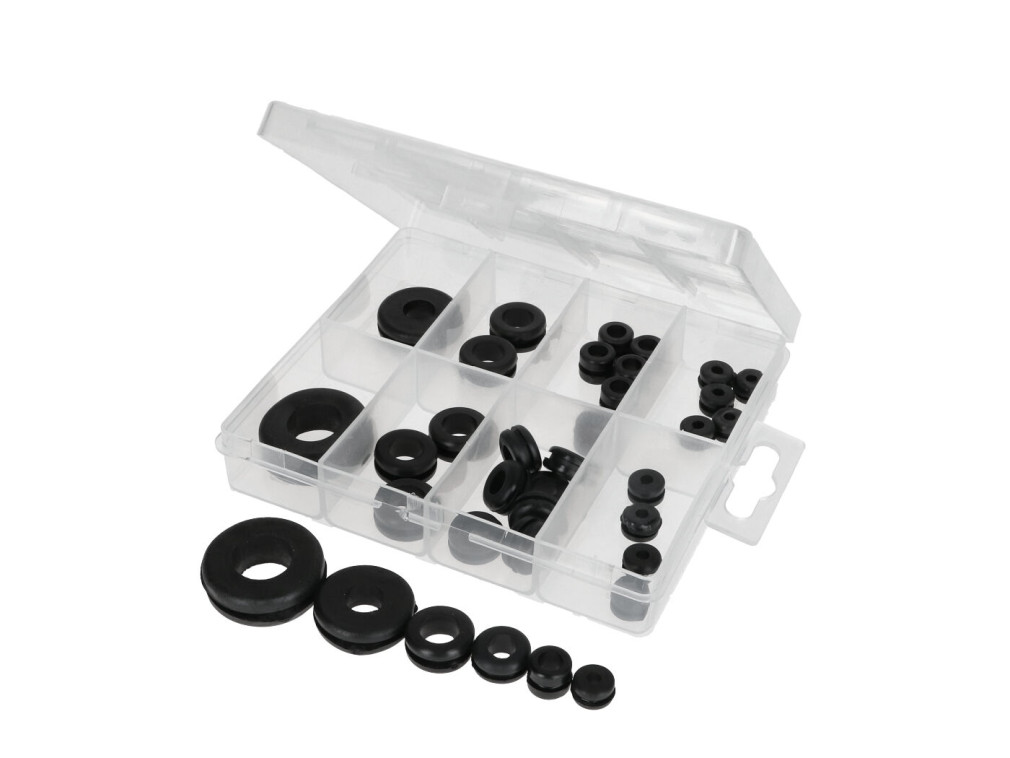 Az Ön rendelkezésére áll egy sokoldalú gumigyűrű készlet, amely 35 darabot tartalmaz különböző méretekben, 2,5x10,5x6,5 mm-től 16x29x7,5 mm-ig, tárolódobozban. Ez a készlet ideális választás mindenféle fúrólyuk és kábel rögzítéséhez.