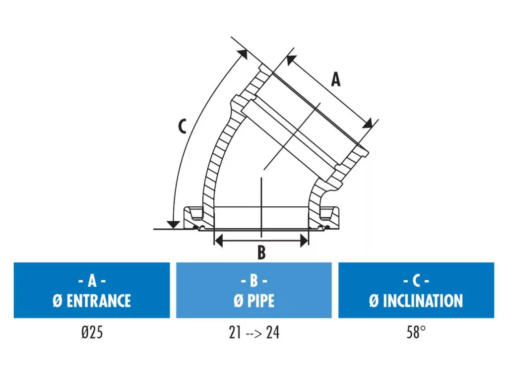 A karburátorhoz való csatlakozás 25 mm-es átmérővel és 58°-os szöggel rendelkezik, ami biztosítja a tökéletes illeszkedést és a zavartalan üzemeltetést. A beömlőrendszerhez tartozó hengerfej 21-24 mm-es méretű, így tökéletesen illeszkedik a motorhoz, és biztosítja a hatékony üzemeltetést.
