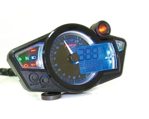 A Koso RX1N GP Style többfunkciós kilométeróra ideális választás minden 12V-os fedélzeti áramellátással rendelkező kétkerekű járműhöz. A termék modern GP stílusú dizájnnal és kék világítással rendelkezik, ami biztosítja a könnyű olvashatóságot éjjel és nappal.