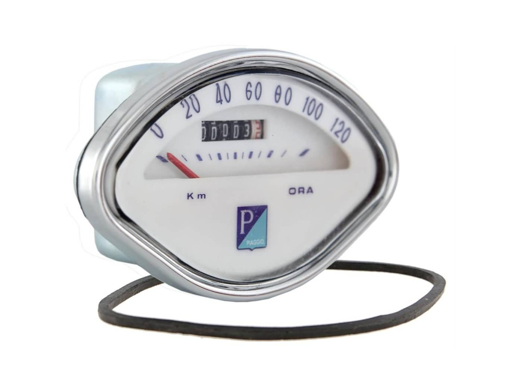 Ez a kiváló minőségű termékleírás bemutatja a PIAGGIO márka egyik ikonikus elemét, amely az old PIAGGIO emblémával díszített, fehér színű arcú és kék számokkal ellátott sebességmérőt tartalmaz. A sebességmérő kiváló minőségű, és akár 120 km/h sebességgel is működik.