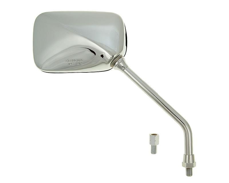 Ez a kiváló minőségű, krómozott univerzális tükröt különféle robogókhoz és motorokhoz tervezték. A négyszögletes formájú tükör mérete 145 mm, magassága 95 mm, így kiváló látóteret biztosít a biztonságos közlekedéshez. A tükör jobb oldali elhelyezésre van tervezve, és 10 mm-es menettel ellátott, ami illeszkedik a legtöbb járműhöz. A jobb oldali tükör bal menettel is rendelkezik, így széleskörű kompatibilitást kínál.